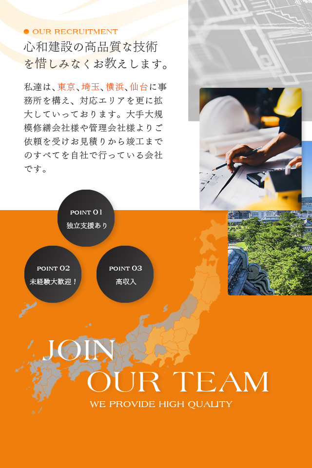 株式会社心和建設では、現在一緒に働いている従業員の方々はそれぞれ他業種からの転職で働いている方がほとんどです。元々飲食店で接客業をやられていた方や元々IT系の会社に勤めていた方など様々な業種からいらっしゃる方が多く、建設業の経験が全くない方でも最初は先輩方が一つ一つ丁寧に教えてくださるので安心して働くことができます。知識や資格がない方でもぜひお気軽にご応募ください。