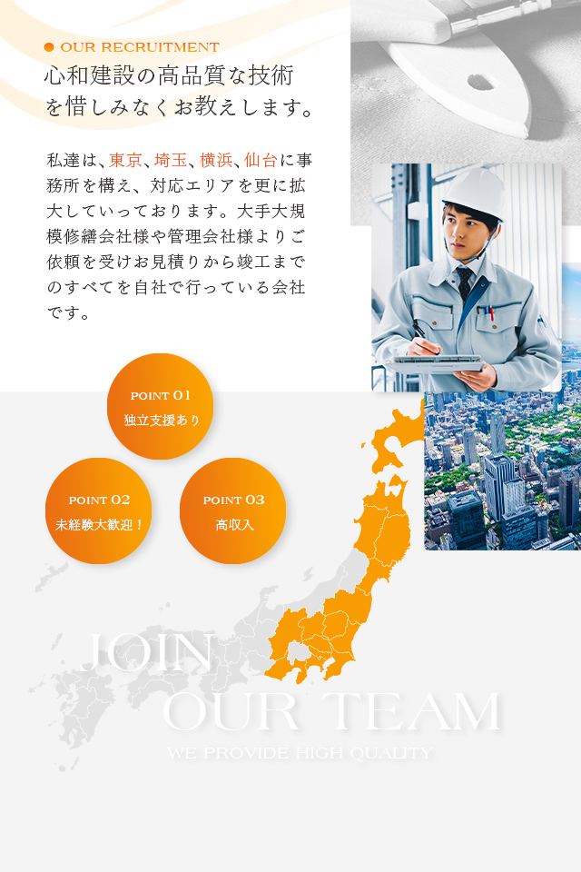 株式会社心和建設では、現在一緒に働いている従業員の方々はそれぞれ他業種からの転職で働いている方がほとんどです。元々飲食店で接客業をやられていた方や元々IT系の会社に勤めていた方など様々な業種からいらっしゃる方が多く、建設業の経験が全くない方でも最初は先輩方が一つ一つ丁寧に教えてくださるので安心して働くことができます。知識や資格がない方でもぜひお気軽にご応募ください。
