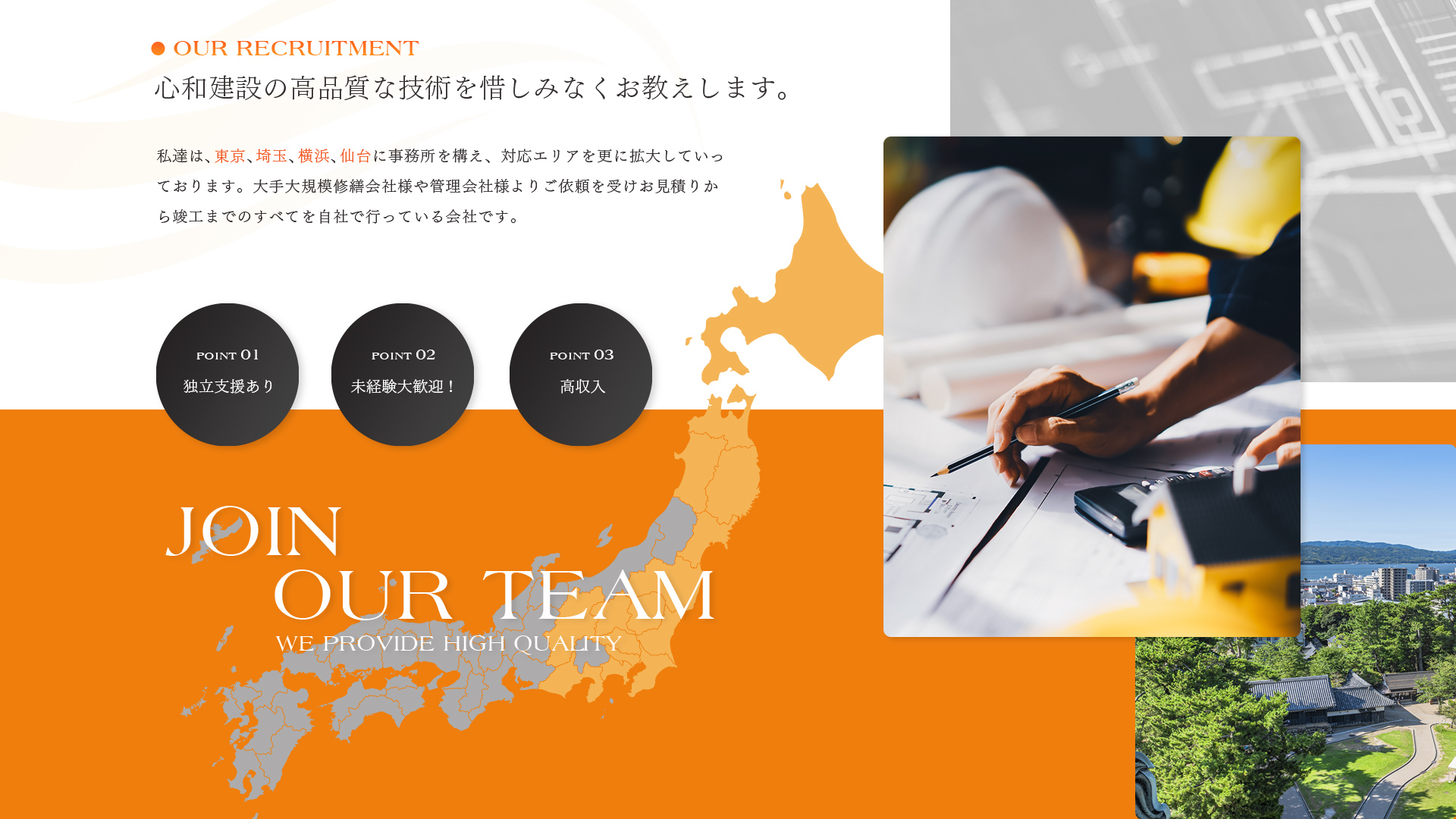 株式会社心和建設では、現在一緒に働いている従業員の方々はそれぞれ他業種からの転職で働いている方がほとんどです。元々飲食店で接客業をやられていた方や元々IT系の会社に勤めていた方など様々な業種からいらっしゃる方が多く、建設業の経験が全くない方でも最初は先輩方が一つ一つ丁寧に教えてくださるので安心して働くことができます。知識や資格がない方でもぜひお気軽にご応募ください。